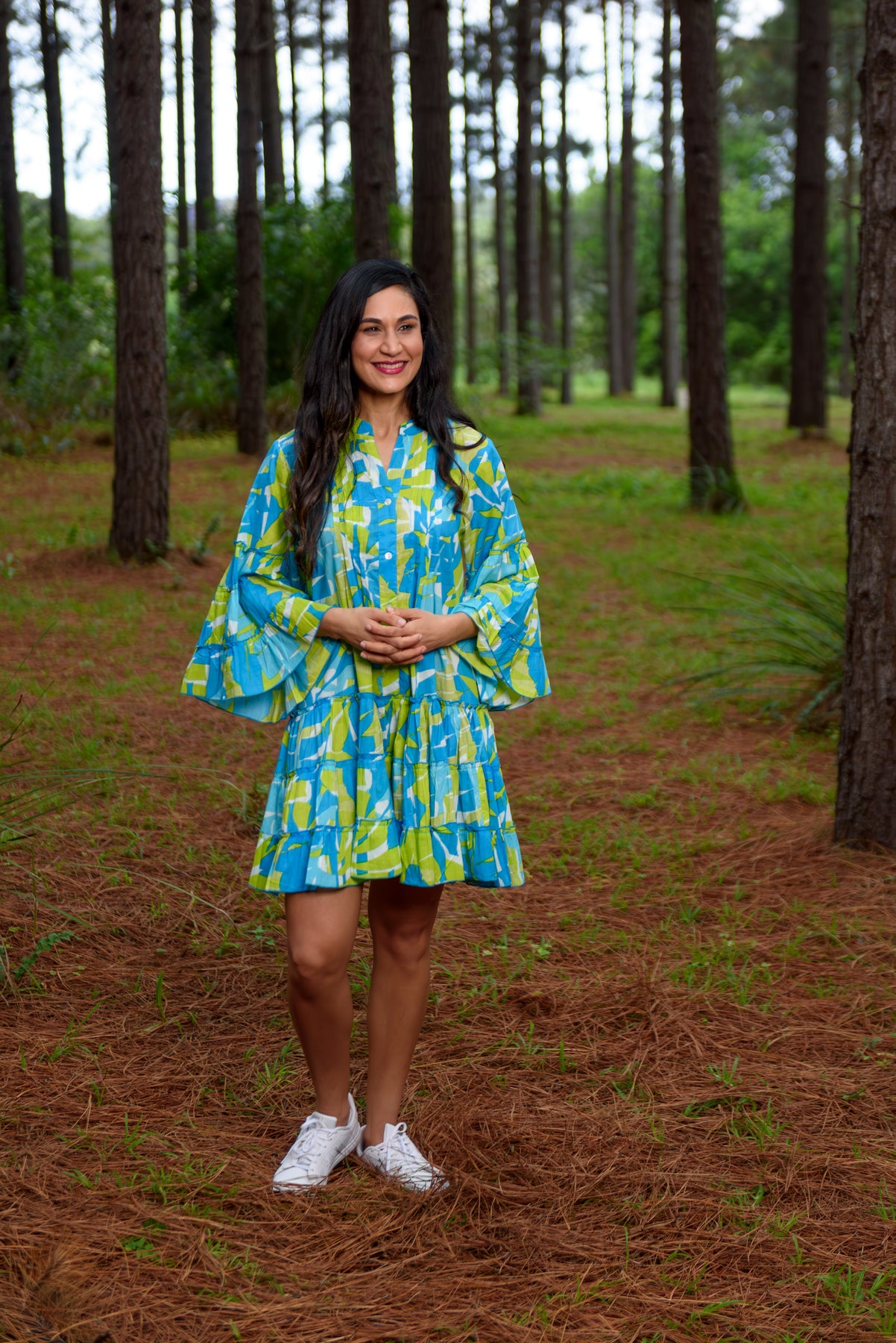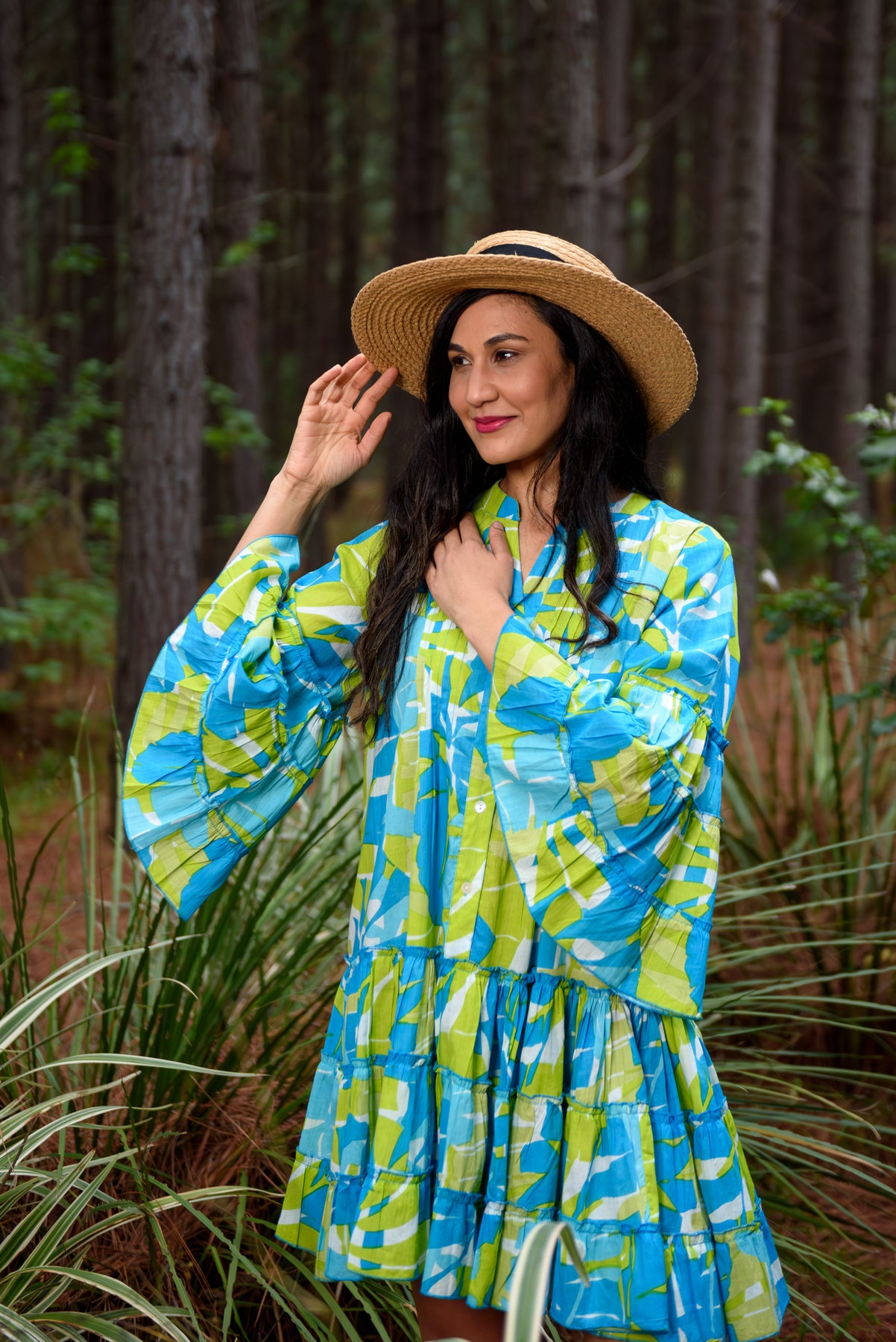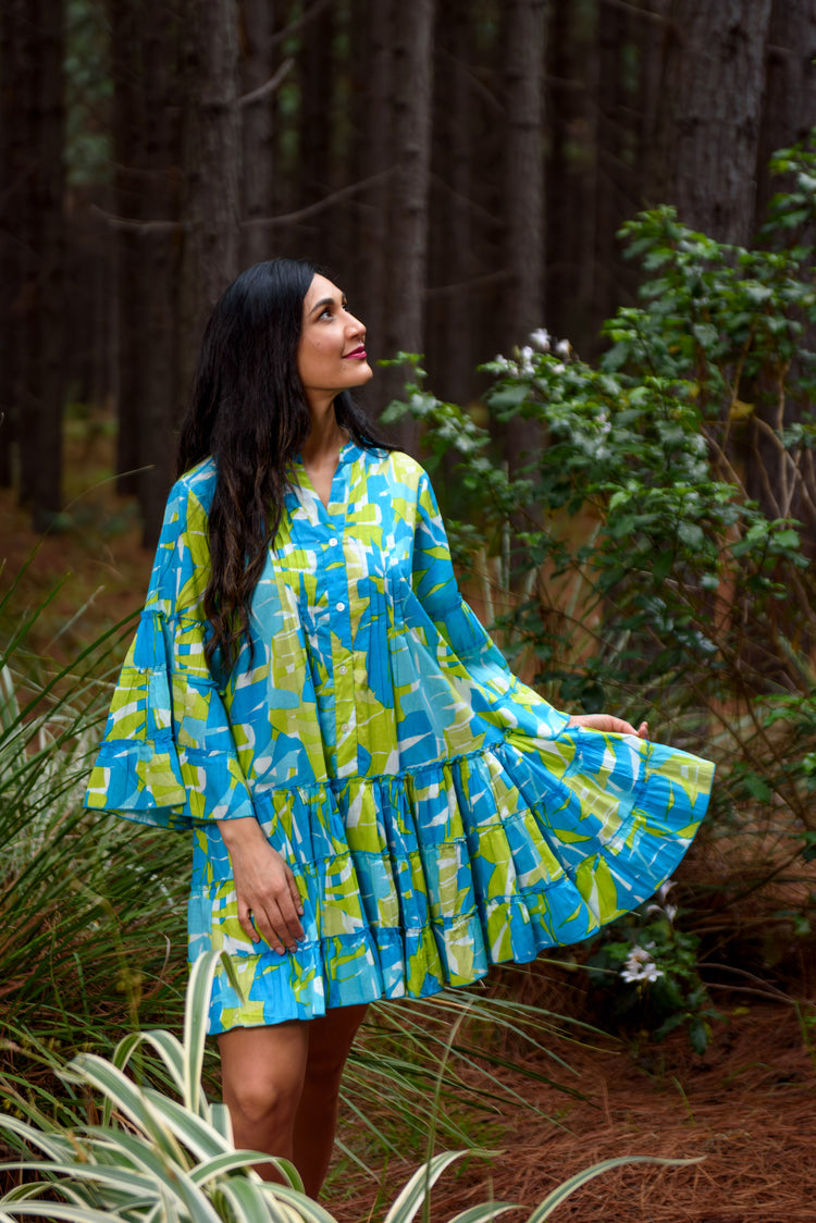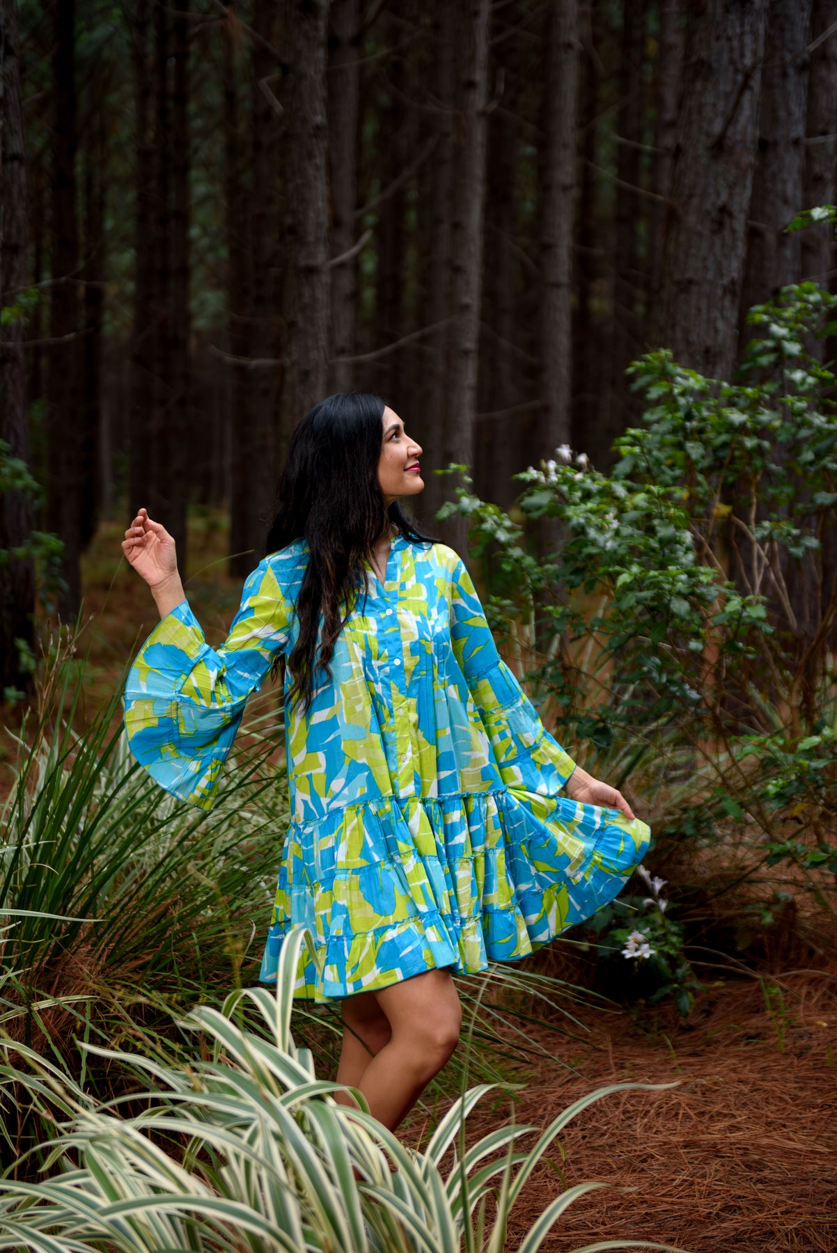 • Soft cotton baby doll flowing dress with tiered frill skirt and 3/4 wide sleeves.