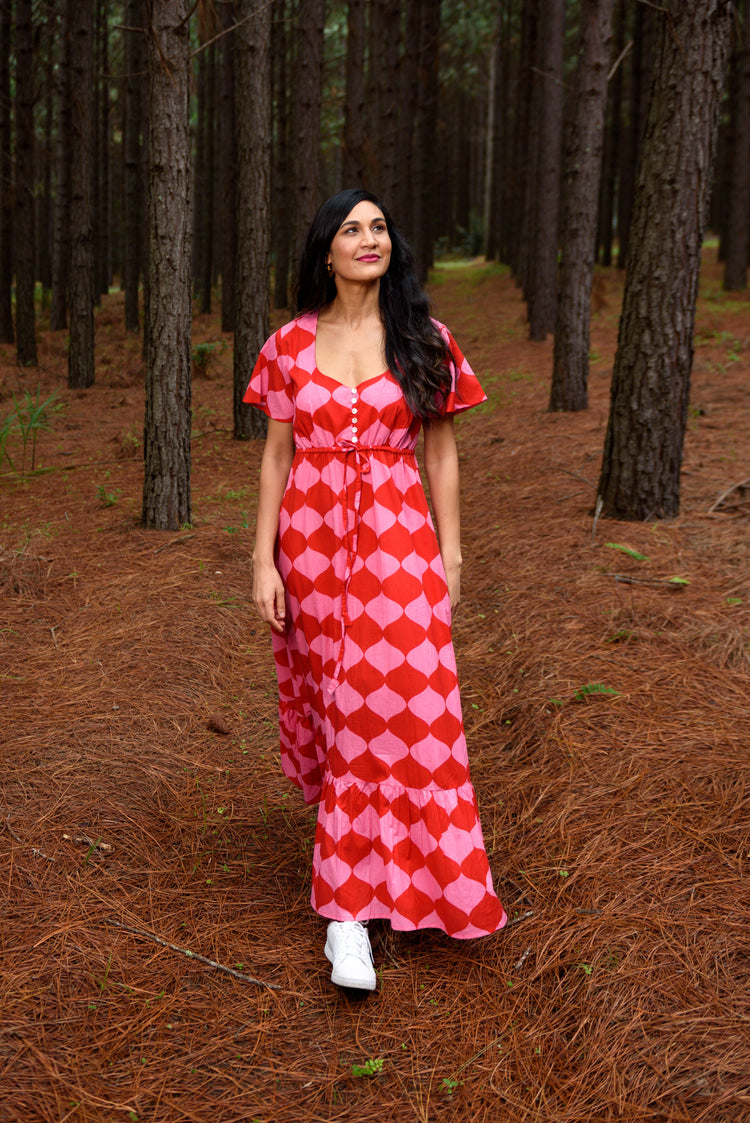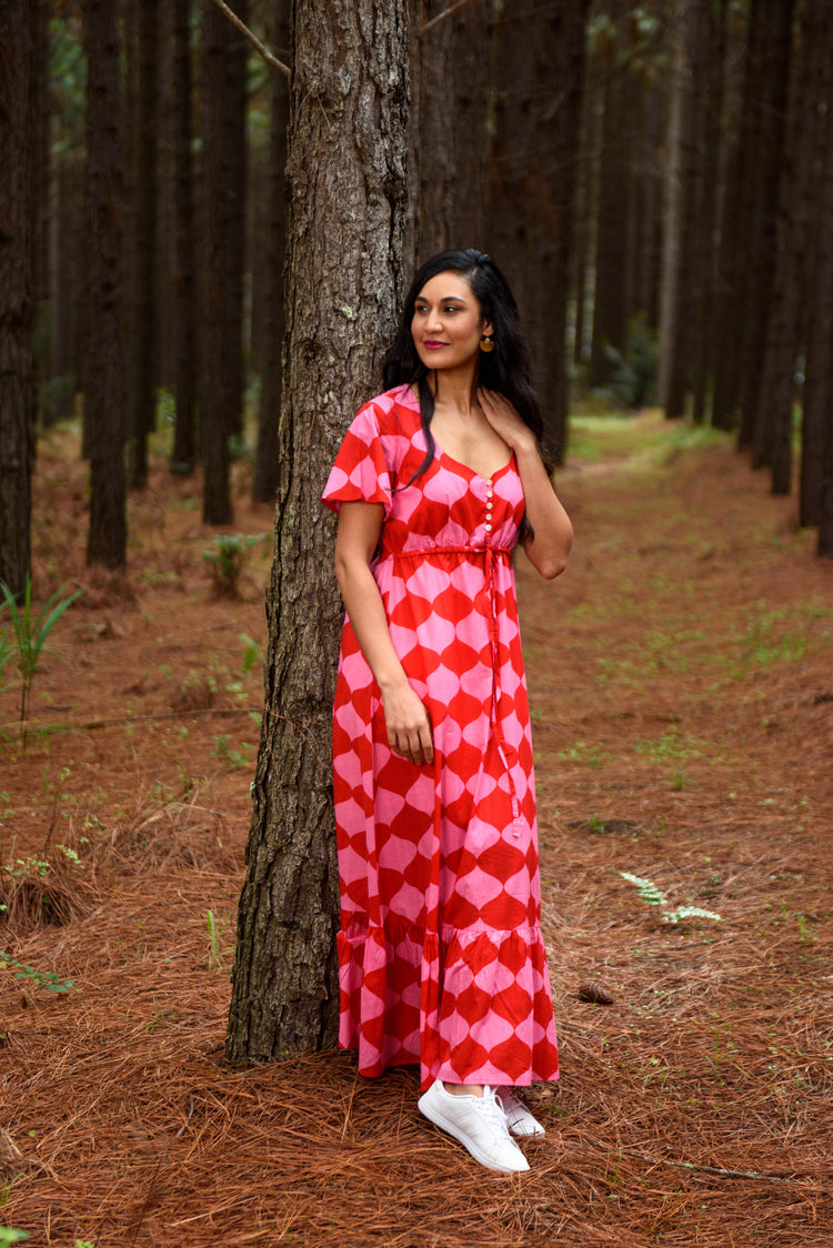 Soft cotton flowing maxi dress with frill detail along the hemline.