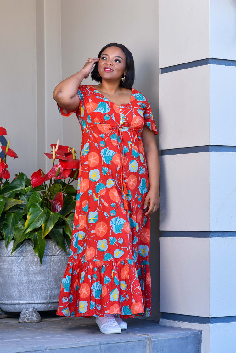 Soft cotton flowing maxi dress with frill detail along the hemline.